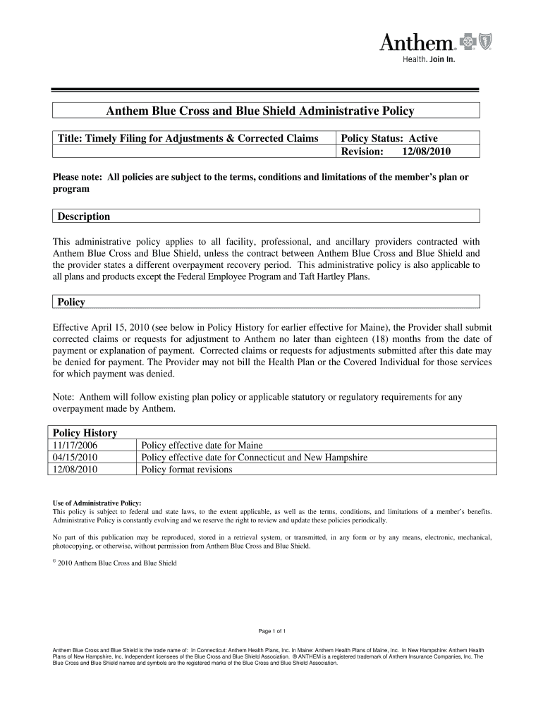 Anthem Blue Cross and Blue Shield Administrative Policy Title: Timely Filing for Adjustments & Corrected ClaimsPolicy Status: Active Revision: 12/08/2010Please note: All policies are subject to the