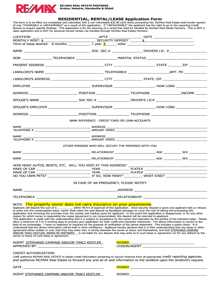 RE/MAX REAL ESTATE PARTNERS Greta, Metairie, Mandeville & Slidell RESIDENTIAL, RENTAL/LEASE Application Form This form is to be filled out completely and submitted with a non-refundable $25.00 ($35-Joint)