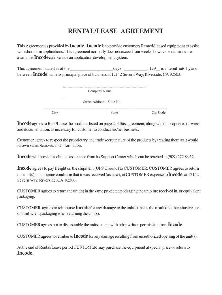RENTAL/LEASE AGREEMENT This Agreement is provided by Income. Income is to provide customers Rented/Leased equipment to assist with short term applications. This agreement normally does not exceed