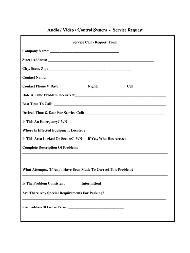 Audio / Video / Control System Service Request Service Call Request Form Company Name: Street Address: City, State, Zip:, Contact Name: Contact Phone # Day: Night: Cell: Date & Time Problem Occurred: