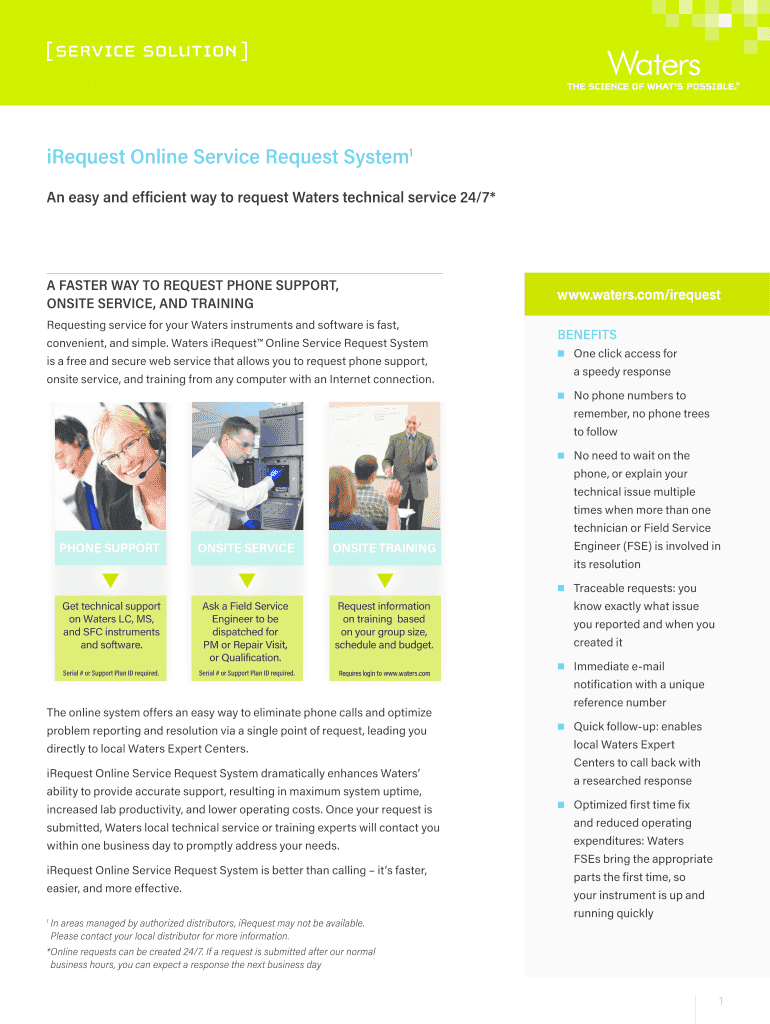 SERVICE SOLUTION request Online Service Request System1 An easy and efficient way to request Waters technical service 24/7×A FASTER WAY TO REQUEST PHONE SUPPORT, ONSITE SERVICE, AND TRAININGwww.waters.com/irequestRequesting