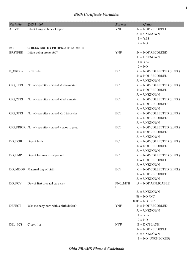 1Birth Certificate Variables Variable SAS LabelFormatALIVEInfant living at time of reporting. N. U 1 2NOT RECORDED UNKNOWN YES NOB BRSTFEDCHILDS BIRTH CERTIFICATE NUMBER Infant being breastfed?YFB