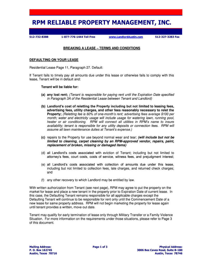 RPM RELIABLE PROPERTY MANAGEMENT, INC. 5127328388 18777761444 Toll Free www.LandlordAustin.com 5123273283 Fax BREAKING A LEASE TERMS AND CONDITIONS DEFAULTING ON YOUR LEASE Residential Lease Page