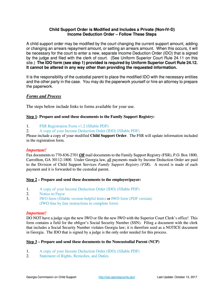 Child Support Order is Modified and Includes a Private (NonIVD) Income Deduction Order Follow These Steps A child support order may be modified by the court changing the current support amount, adding