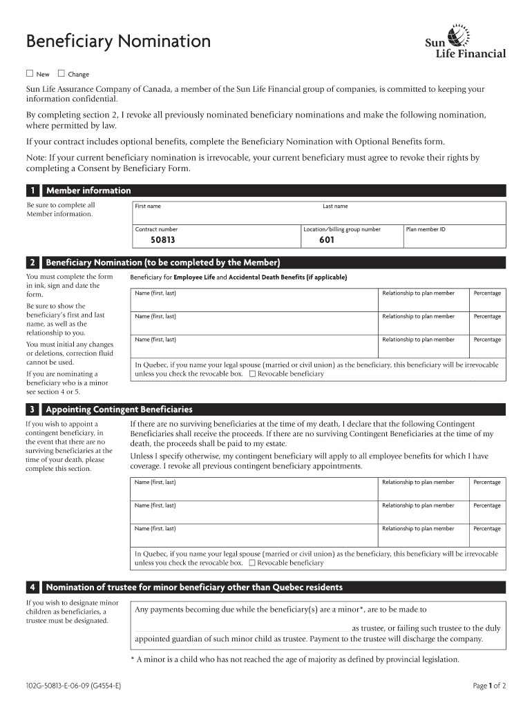 Beneficiary Nomination m New m Change Sun Life Assurance Company of Canada, a member of the Sun Life Financial group of companies, is committed to keeping your information confidential. By completing