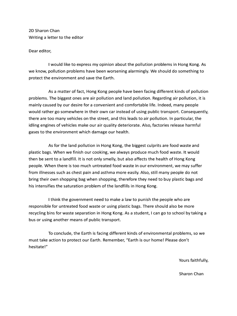 I would like to express my opinion about the pollution problems in Hong Kong. As