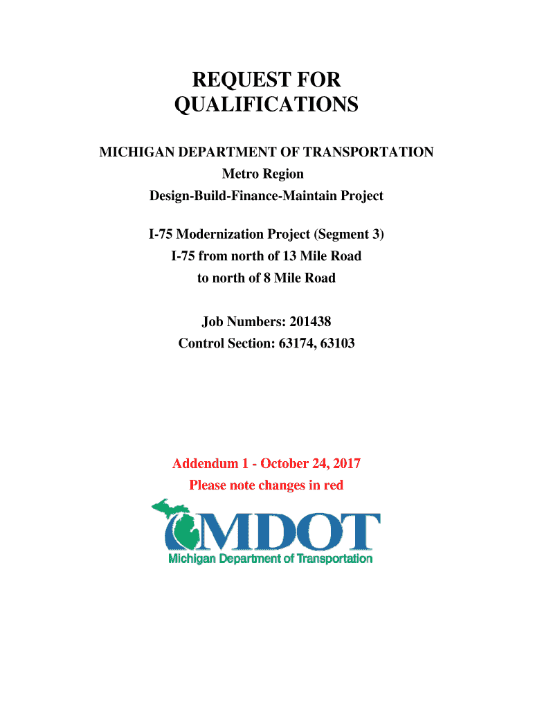 REQUEST FOR QUALIFICATIONS MICHIGAN DEPARTMENT OF TRANSPORTATION Metro Region DesignBuildFinanceMaintain Project I75 Modernization Project (Segment 3) I75 from north of 13 Mile Road to north of 8