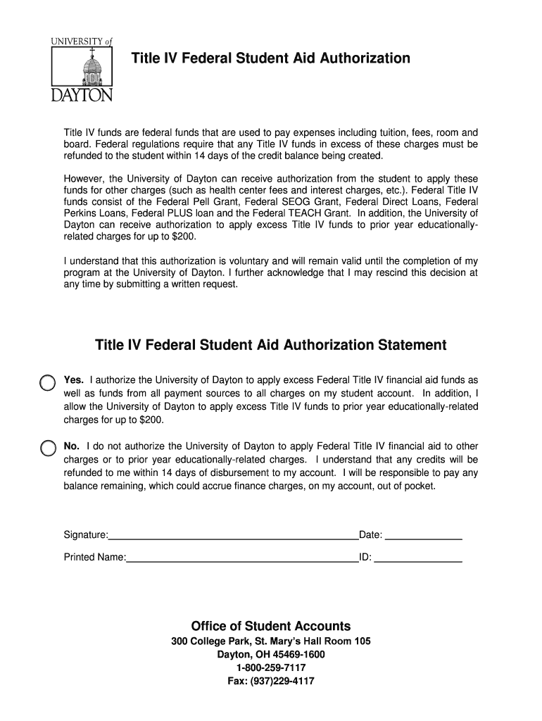 The Title IV Federal Student Aid Authorization is a financial aid application form used by students at the University of Dayton to authorize federal financial aid funds for various charges.