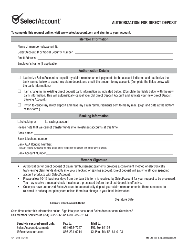 Any member of SelectAccount who wishes to set up or update their direct deposit for reimbursement payments is eligible to use this Authorization for Direct Deposit form.