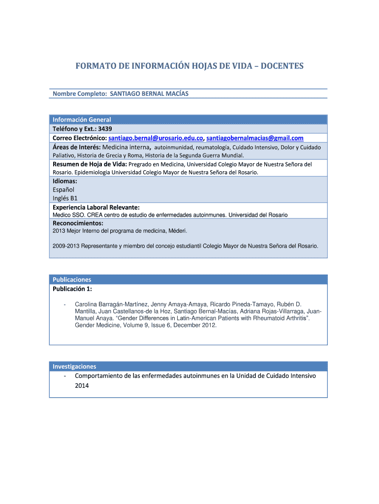 FORMAT ODE INFORMATION ROJAS DE VIDA DOCENTS Hombre Complete: SANTIAGO VERNAL MACASInformacin General Teflon y Ext.: 3439 Core Electric: Santiago. Vernal Rosario.edu.co, santiagobernalmacias gmail.com