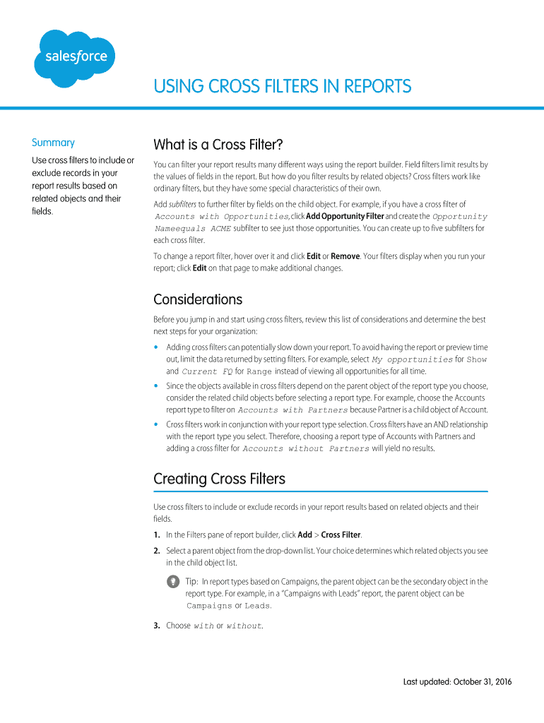 Users who need to filter data across different objects in Salesforce reports are required to use cross filters.