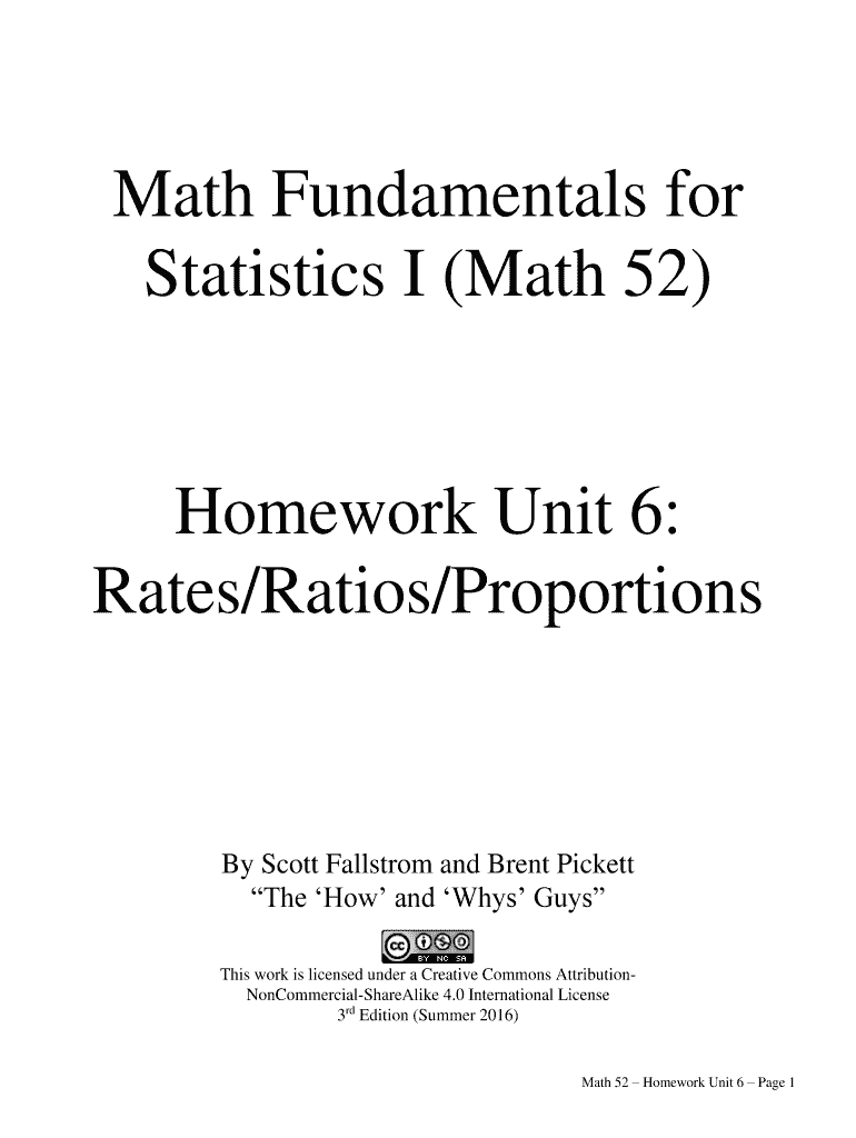Math Fundamentals for Statistics I (Math 52)Homework Unit 6: Rates/Ratios/Proportions Scott Maelstrom and Brent Pickett The How and Why's Guys This work is licensed under a Creative Commons AttributionNonCommercialShareAlike