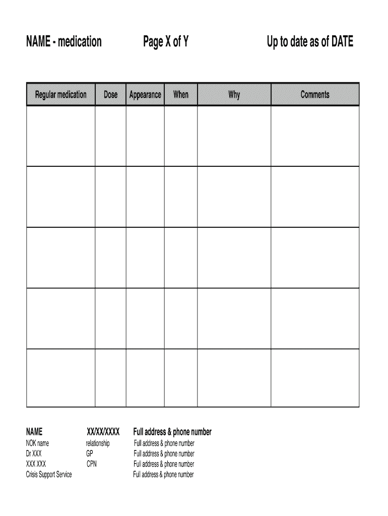 NAME medication Page X of Yup to date as of DATE !! Regular medicationDoseAppearanceWhenWhyComments! ! ! ! NAME/XX/XXXXFull address & phone number !NOK name Dr XXX XXX XXX Crisis Support Service relationship