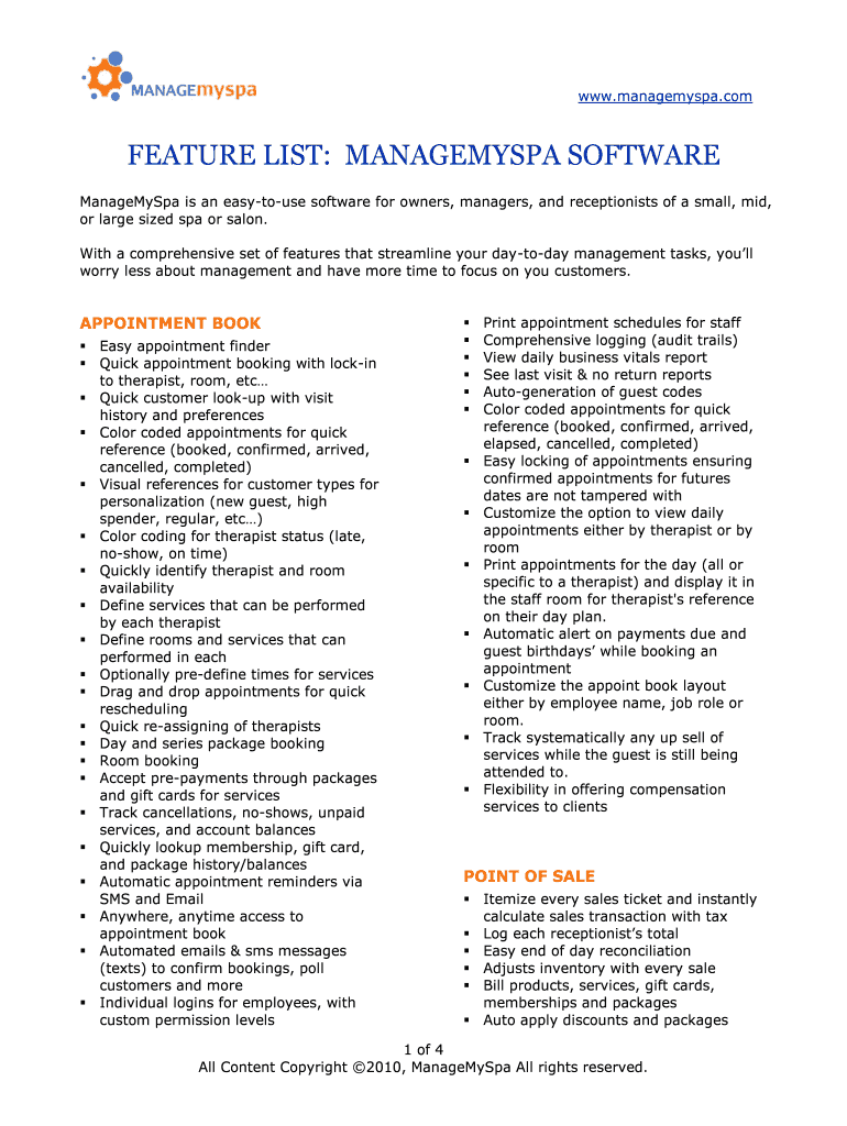 WWW.managemyspa.feature LIST: MANAGEMYSPA SOFTWARE ManageMySpa is an espoused software for owners, managers, and receptionists of a small, mid, or large sized spa or salon. With a comprehensive set