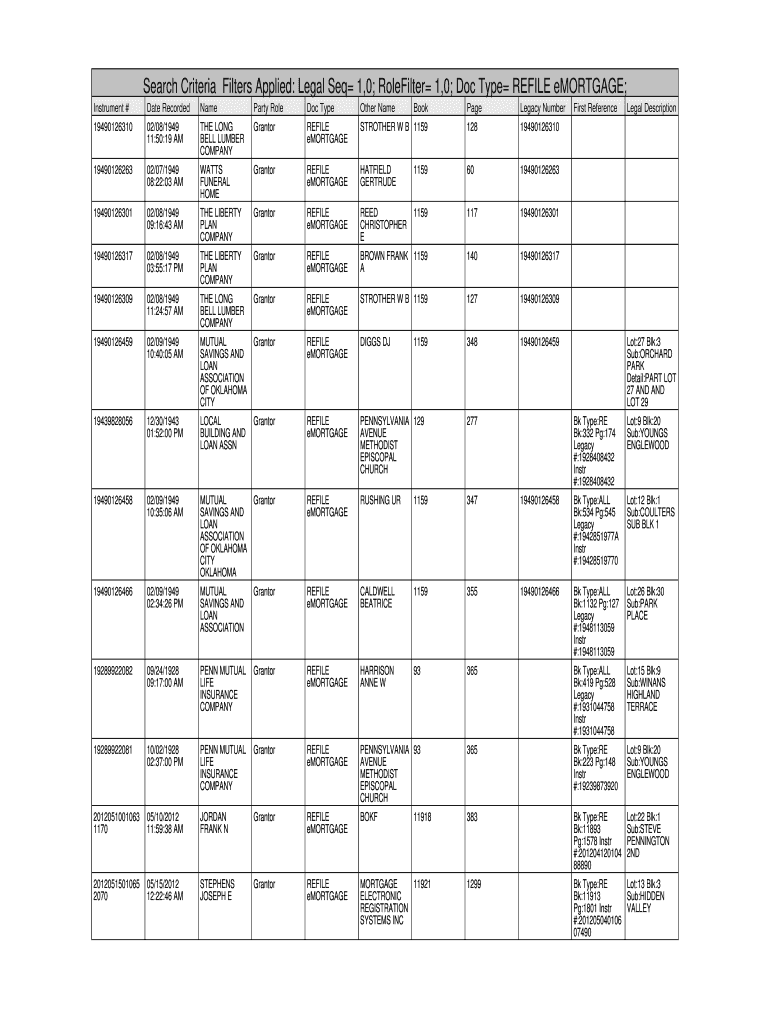 Search Criteria Filters Applied: Legal Seq 1,0; Prefilter 1,0; Doc Type REFILE mortgage;
