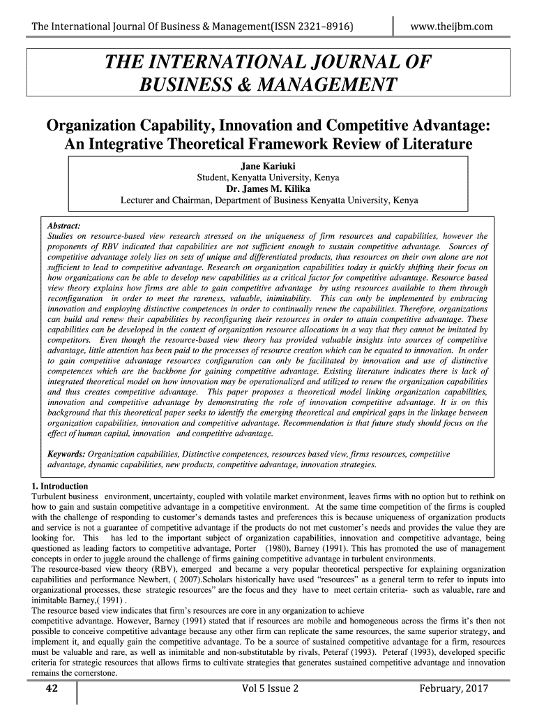 The International Journal Of Business & Management(ISSN 23218916)www.theijbm.comTHE INTERNATIONAL JOURNAL OF BUSINESS & MANAGEMENT Organization Capability, Innovation and Competitive Advantage: An