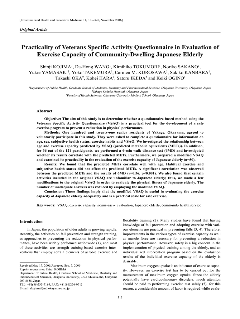 Environmental Health and Preventive Medicine 11, 313320, November 2006 Original ArticlePracticality of Veterans Specific Activity Questionnaire in Evaluation of Exercise Capacity of CommunityDwelling