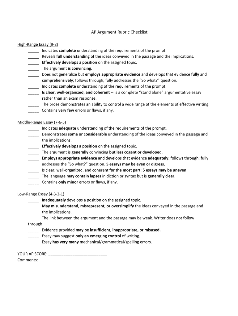 Get the free AP Argument Rubric Checklist