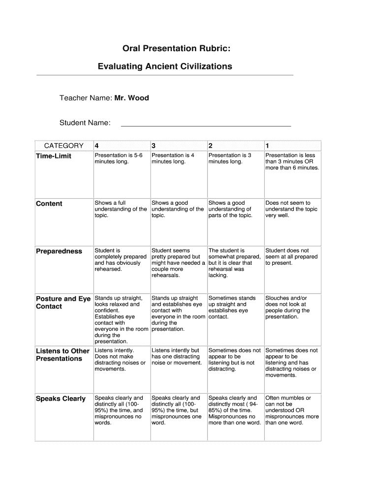 Oral Presentation Rubric: Evaluating Ancient CivilizationsTeacher Name: Mr. WoodStudent Name: CATEGORY 4321TimeLimitPresentation is 56 minutes long. Presentation is 4 minutes long. Presentation is