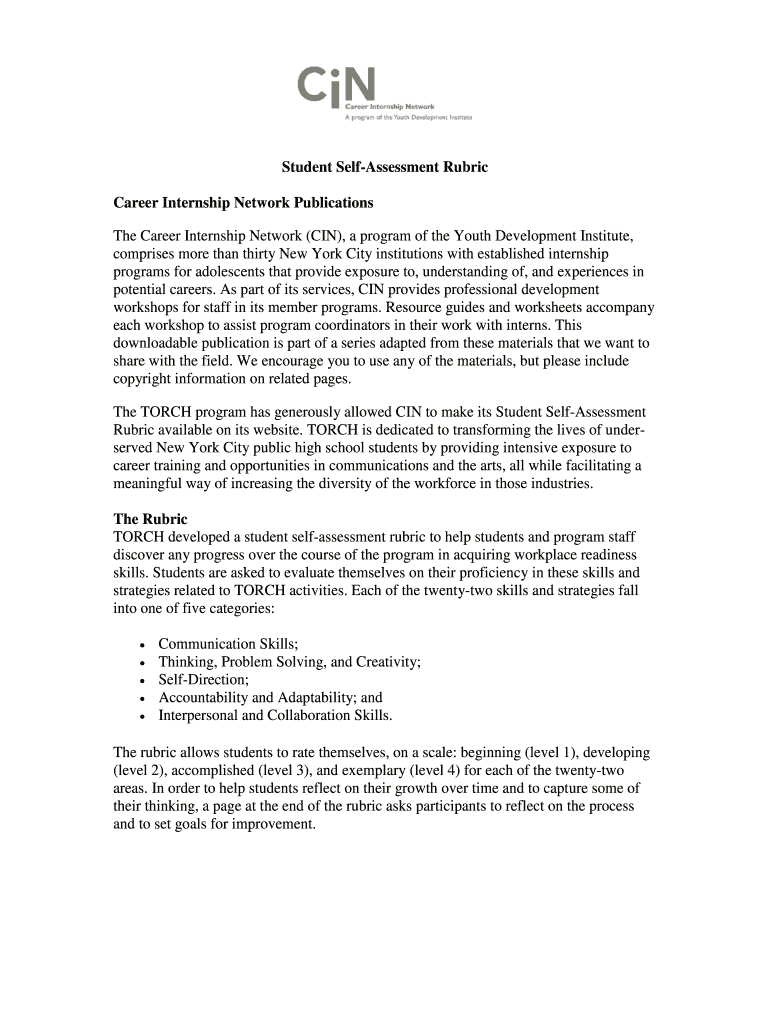 Start by reviewing the criteria and objectives of the self-assessment rubric.
