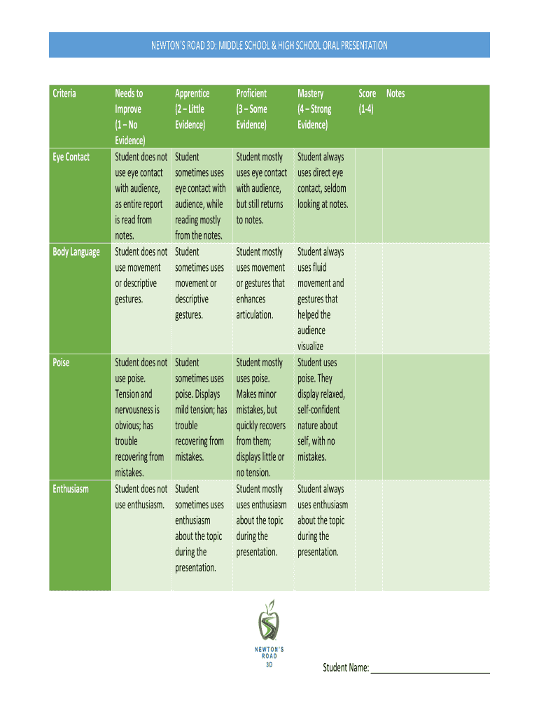 NEWTONS ROAD 3D: MIDDLE SCHOOL & HIGH SCHOOL ORAL PRESENTATION