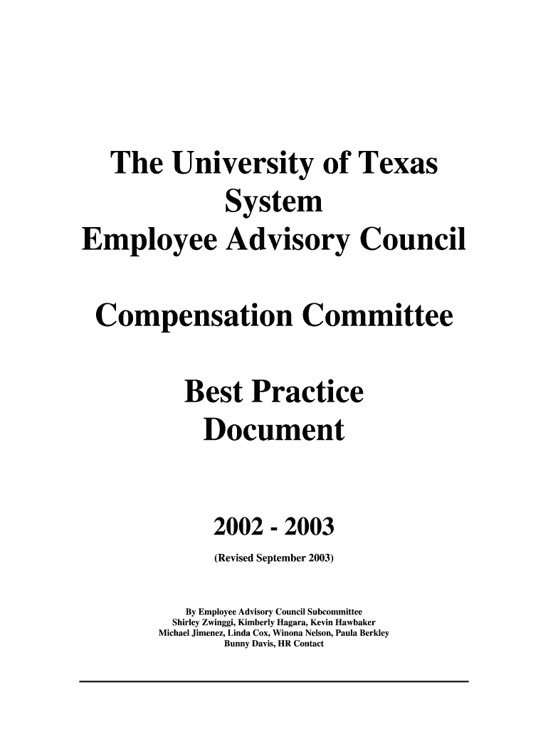 The University of Texas System Employee Advisory Council Compensation Committee Best Practice Document 2002 2003 (Revised September 2003)By Employee Advisory Council Subcommittee Shirley Zwingli,