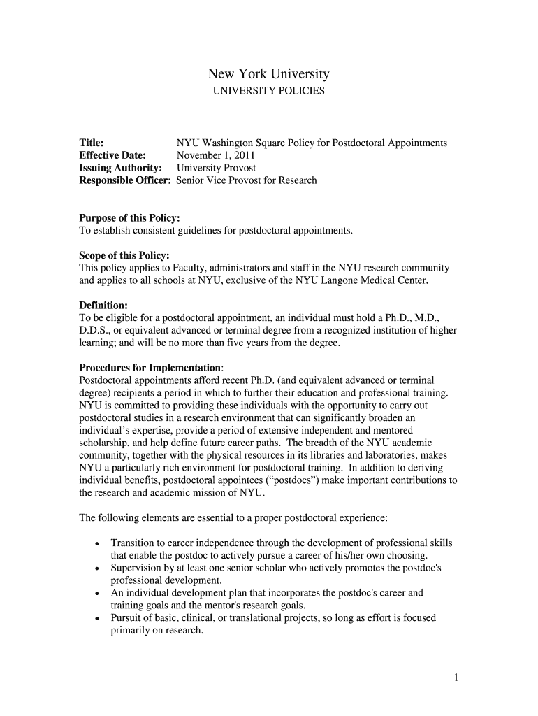Responsible Officer:NYU Washington Square Policy for Postdoctoral Appointments