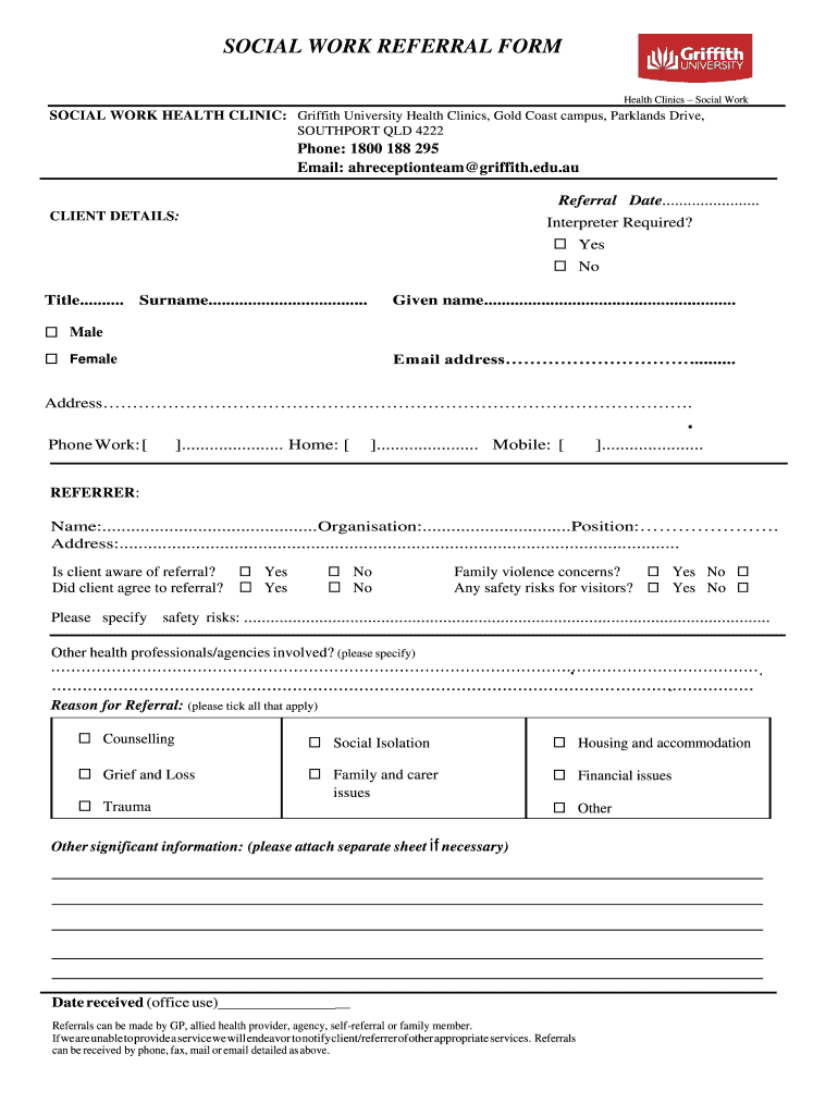 SOCIAL WORK REFERRAL FORM Health Clinics Social Nonsocial WORK HEALTH CLINIC : Griffith University Health Clinics, Gold Coast campus, Parkland Drive, SOUTHPORT QLD 4222Phone: 1800 188 295 Email: ahreceptionteam