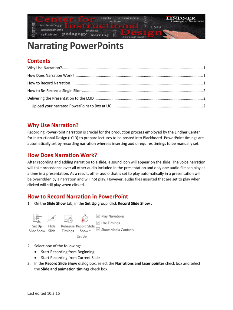 Narrating powerpoints is the process of adding audio narration to a PowerPoint presentation.