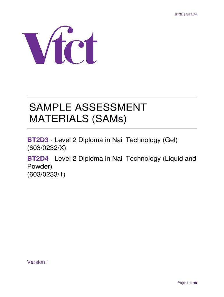 BT2D3.BT2D4SAMPLE ASSESSMENT MATERIALS (SAM's) BT2D3 Level 2 Diploma in Nail Technology (Gel) (603/0232/X) BT2D4 Level 2 Diploma in Nail Technology (Liquid and Powder) (603/0233/1)Version 1Page 1