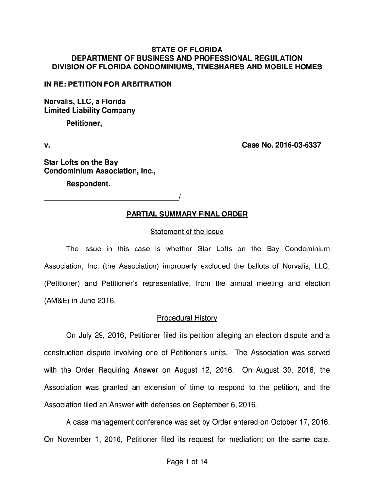 STATE OF FLORIDA DEPARTMENT OF BUSINESS AND PROFESSIONAL REGULATION DIVISION OF FLORIDA CONDOMINIUMS, TIMESHARES AND MOBILE HOMES IN RE: PETITION FOR ARBITRATION Corvallis, LLC, a Florida Limited