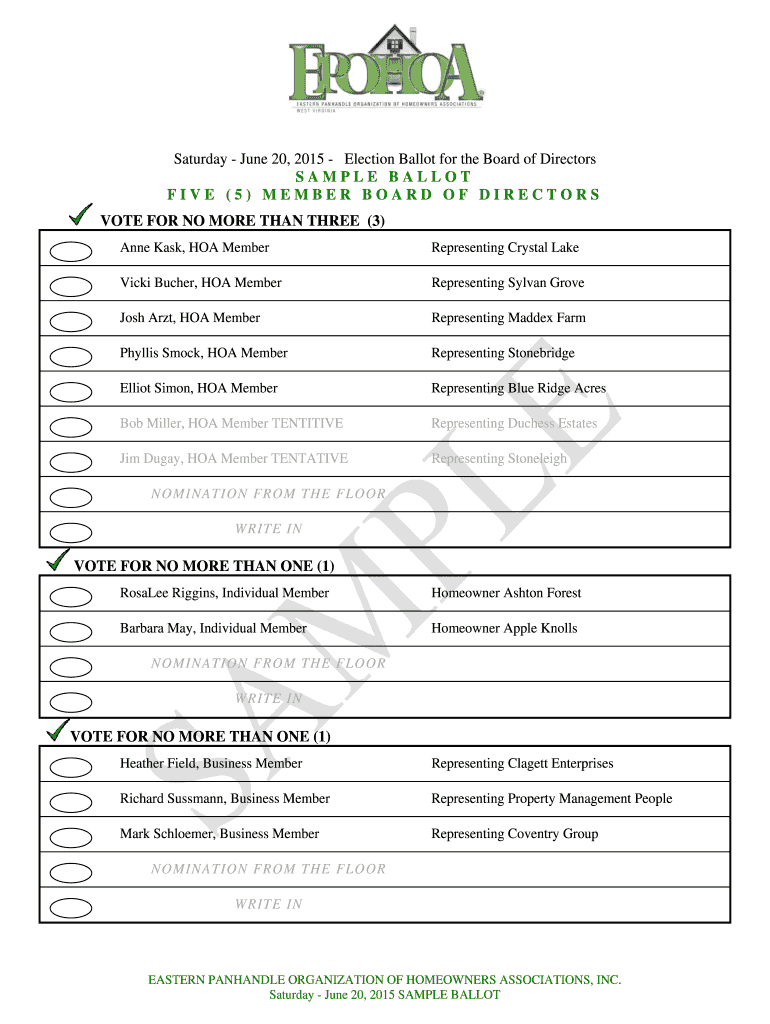 Saturday, June 20, 2015, Election Ballot for the Board of Directors SAMPLE BALLOT FIVE (5) MEMBER BOARD OF DIRECTORS VOTE FOR NO MORE THAN THREE (3) Anne Task, HOA MemberRepresenting Crystal Lake