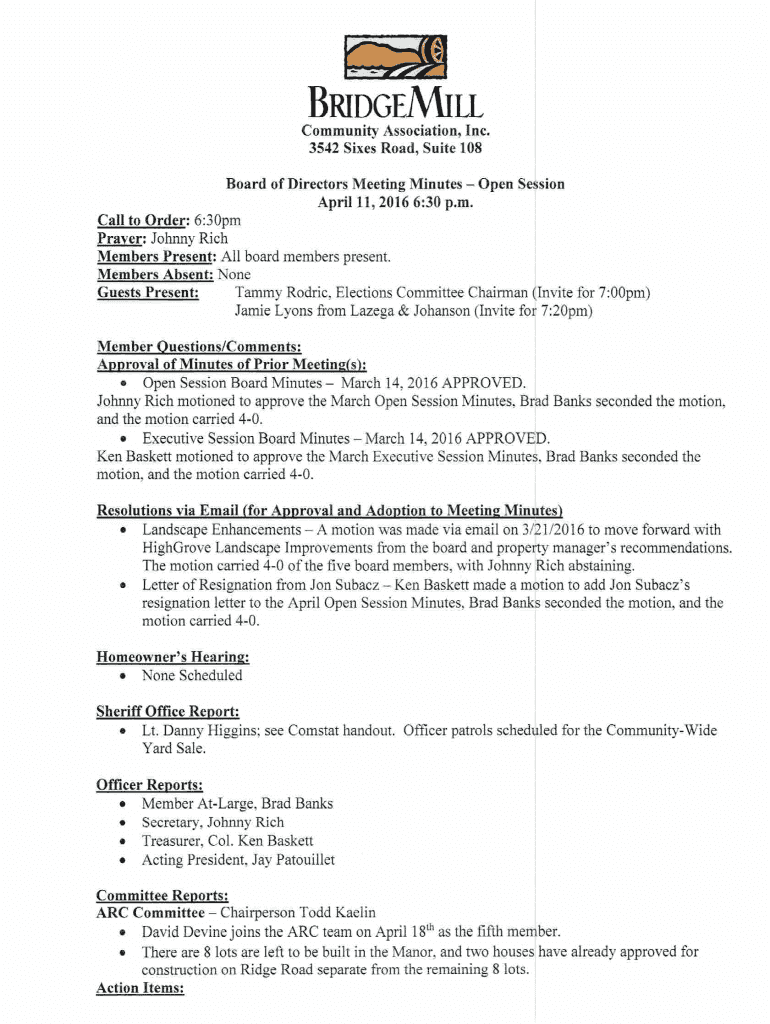 Board of Directors MeetingDear Bridge Mill Board of Directors,