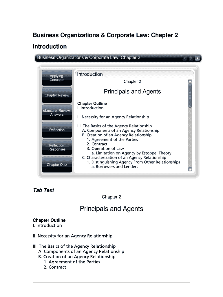 Business Organizations & Corporate Law: Chapter 2 Introduction Text Chapter 2Principals and Agents Chapter Outline I. Introduction II. Necessity for an Agency Relationship III. The Basics of the Agency