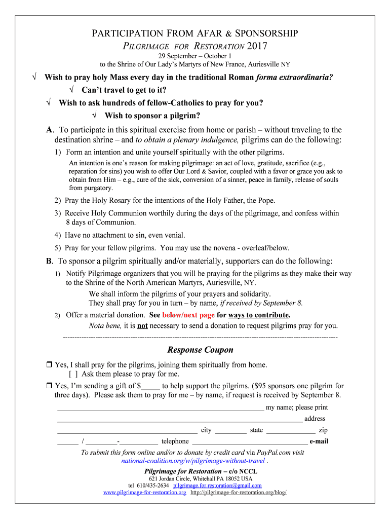 PARTICIPATION FROM AFAR & SPONSORSHIP PILGRIMAGE FOR RESTORATION 2017 29 September October 1 to the Shrine of Our Lady's Martyrs of New France, Africville NY Wish to pray holy Mass every day in the
