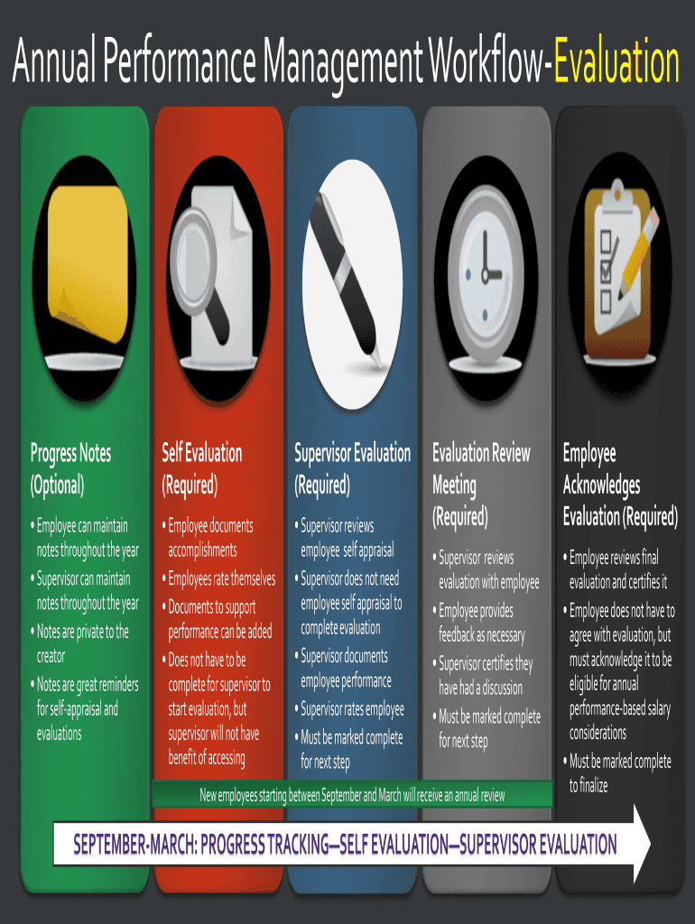 Annual Performance Management WorkflowEvaluationProgress Notes (Optional)Self Evaluation (Required)Supervisor Evaluation (Required) Employee can maintain notes throughout the year Supervisor can maintain
