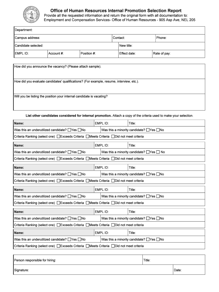 Office of Human Resources Internal Promotion Selection Report Provide all the requested information and return the original form with all documentation to: Employment and Compensation Services Office