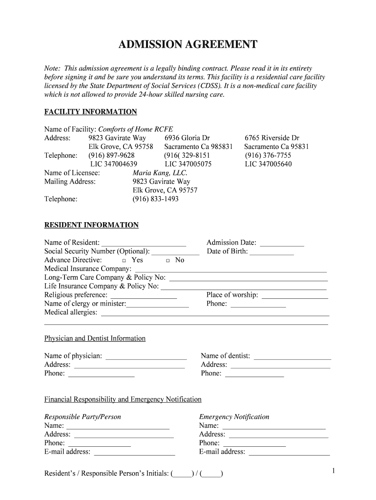 Get the free Note: This admission agreement is a legally binding contract