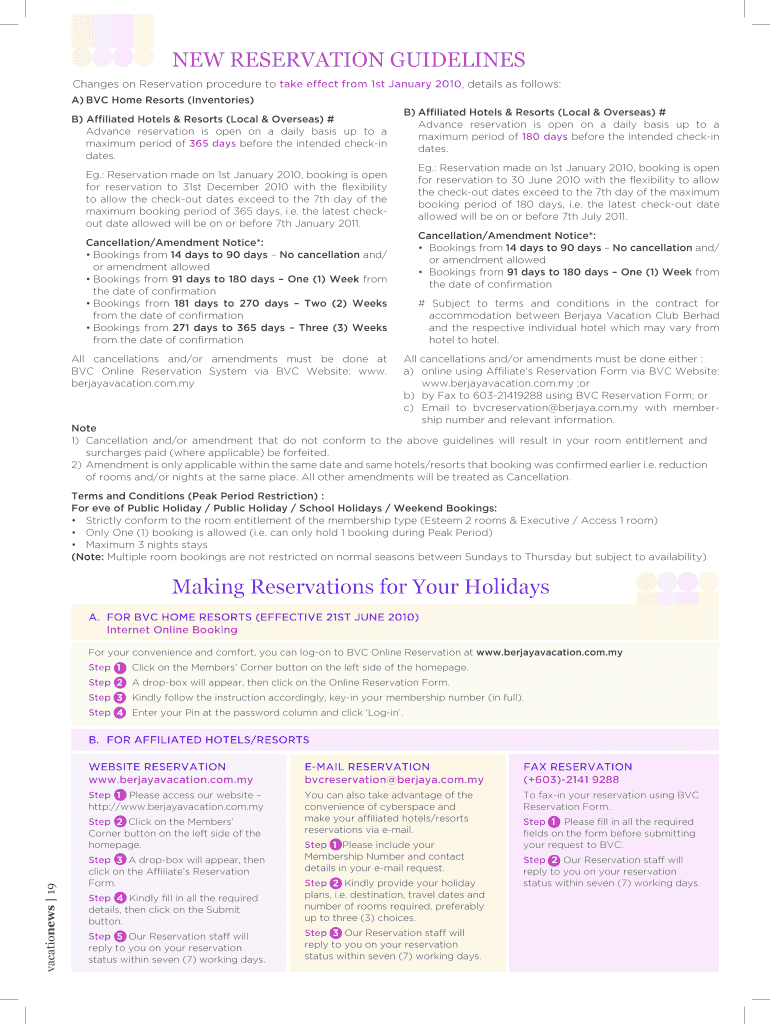 NEW RESERVATION GUIDELINES Changes on Reservation procedure to take effect from 1st January 2010, details as follows: A) BVC Home Resorts (Inventories)B) Affiliated Hotels & Resorts (Local & Overseas)
