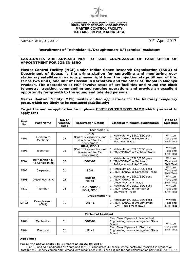 HASSAN 573 201, KARNATAKA01st April 2017Advt. No.MCF/01/2017Recruitment of Technician/DraughtsmanB/Technical