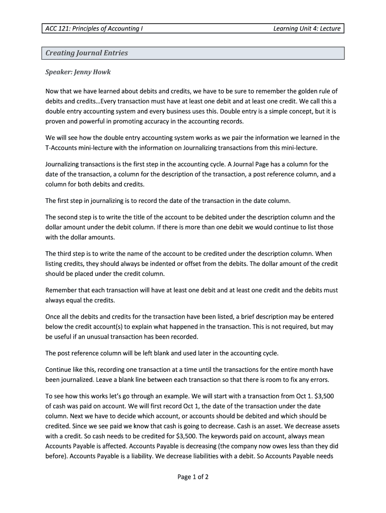 ACC 121: Principles of Accounting Learning Unit 4: LectureCreating Journal Entries
