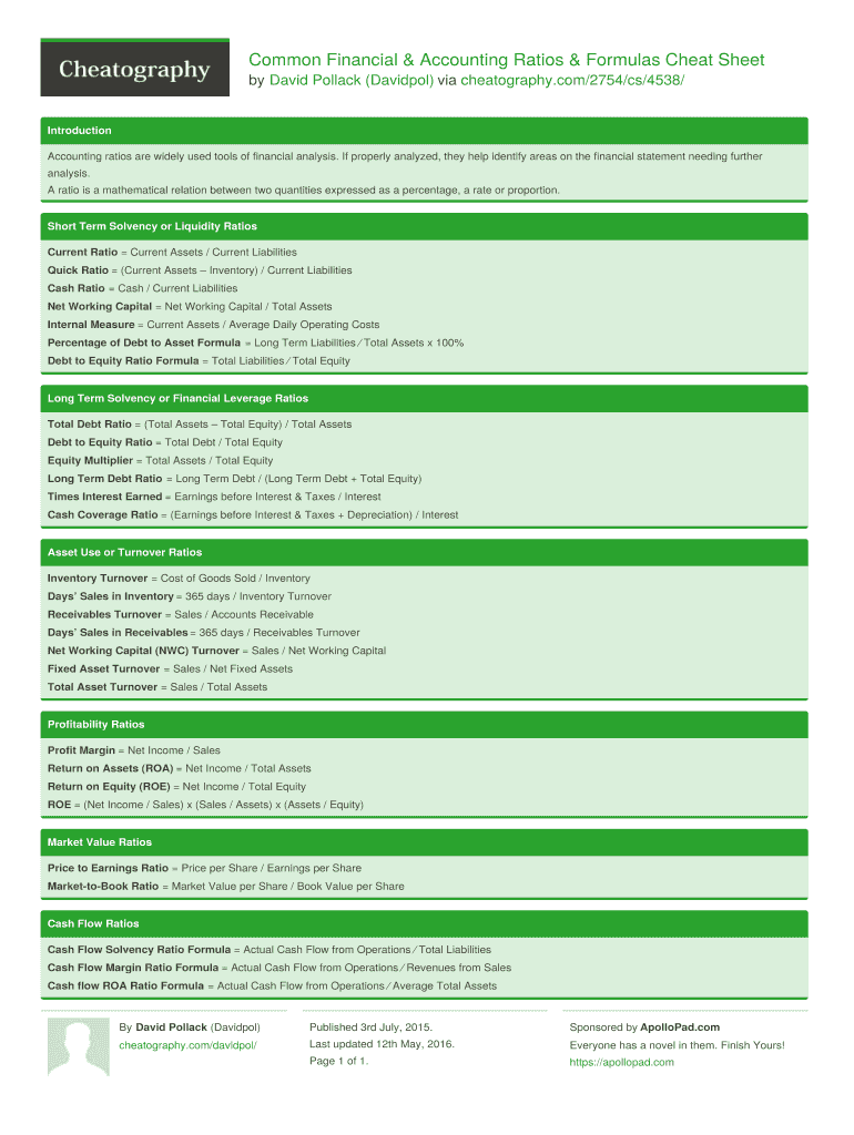 Common Financial & Accounting Ratios & Formulas Cheat Sheet by David Pollack (David pol) via cheatography.com/2754/cs/4538/ Introduction Accounting ratios are widely used tools of financial analysis.