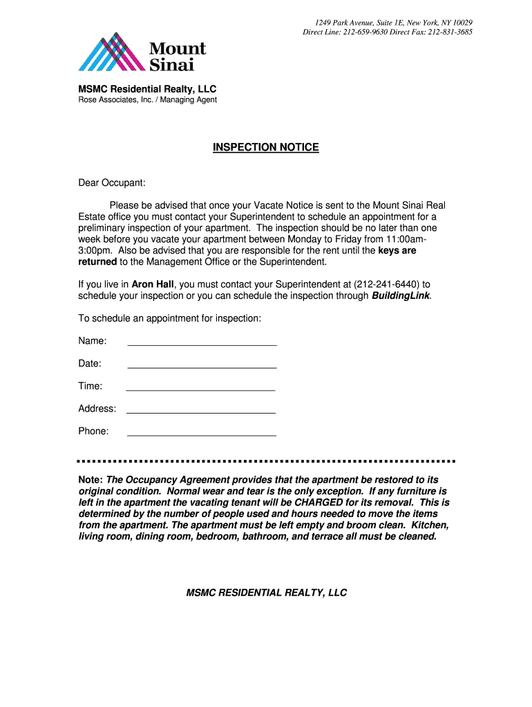 Rose Associates, Inc. / Managing AgentINSPECTION NOTICE