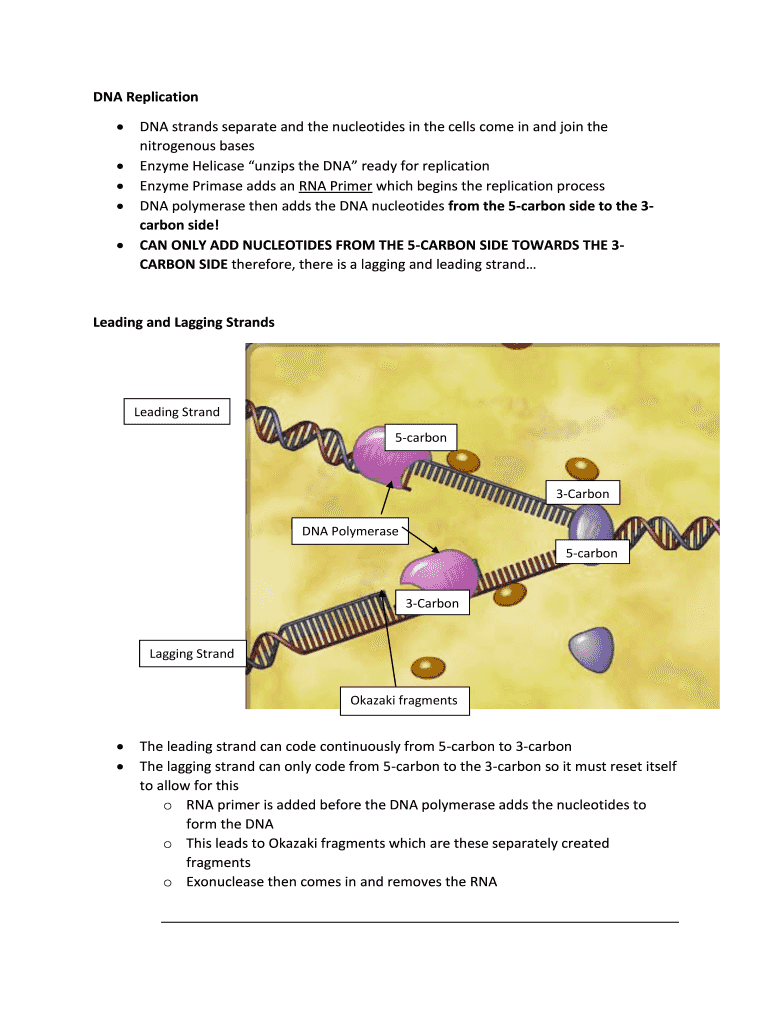 DNA Replication DNA strands separate and the nucleotides in the cells come in and join the nitrogenous bases Enzyme Helicase unzips the DNA ready for replication Enzyme Primate adds an RNA Primer