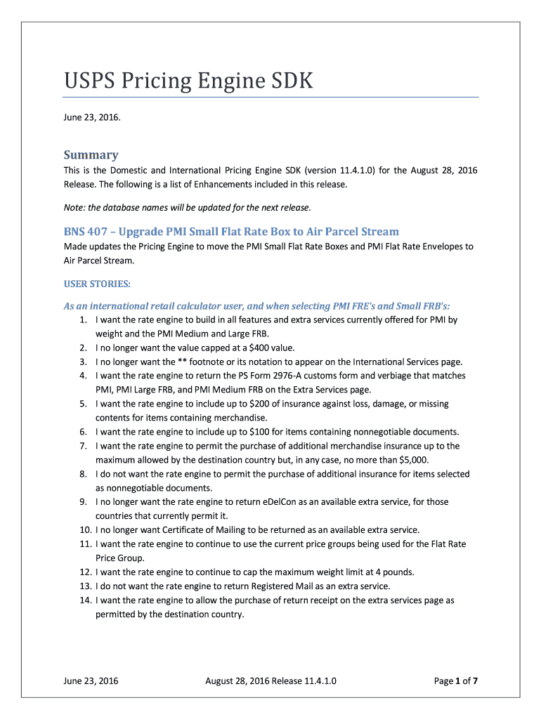 USPS Pricing Engine SDK June 23, 2016. Summary This is the Domestic and International Pricing Engine SDK (version 11.4.1.0) for the August 28, 2016, Release. The following is a list of Enhancements