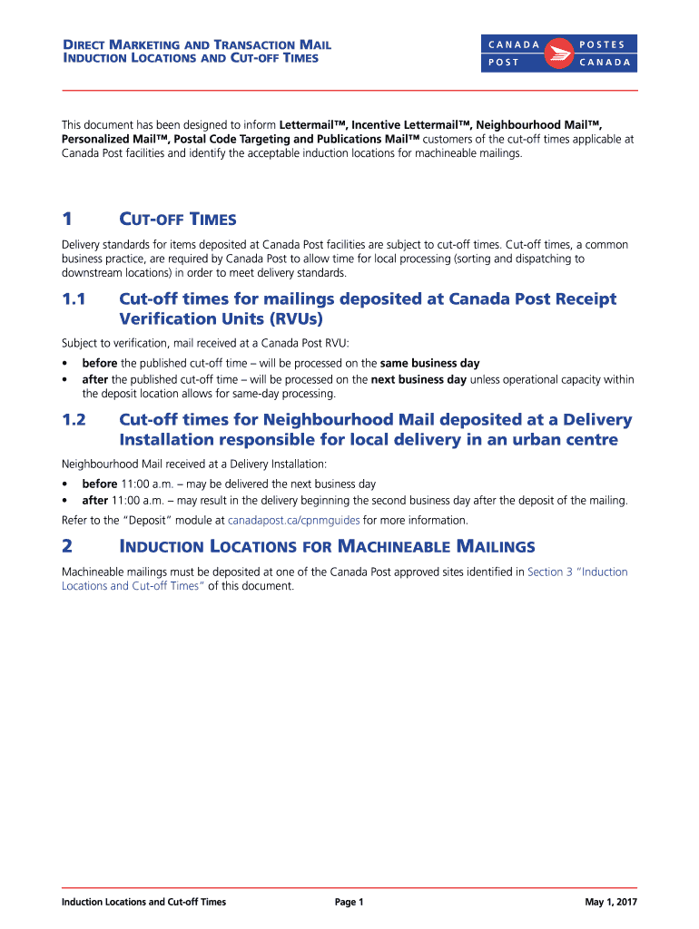 INDUCTION LOCATIONS AND CUTOFF Timestamp document has been designed to inform Letter mail, Incentive Letter mail, Neighborhood Mail,