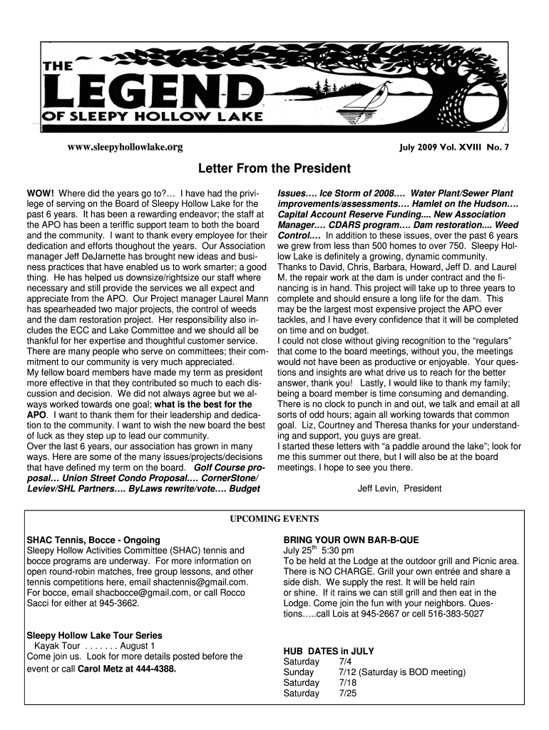 July 2009 Vol. XVIII No. 7www.sleepyhollowlake.letter From the President