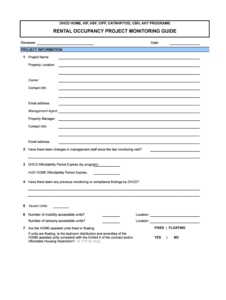DCD HOME, HIF, HSF, CPF, CATNIP/TOD, CBH, AHT PROGRAMS RENTAL OCCUPANCY PROJECT MONITORING GUIDE Reviewer: Date: PROJECT INFORMATION 1 Project Name: Property Location: Owner: Contact info: Email address: