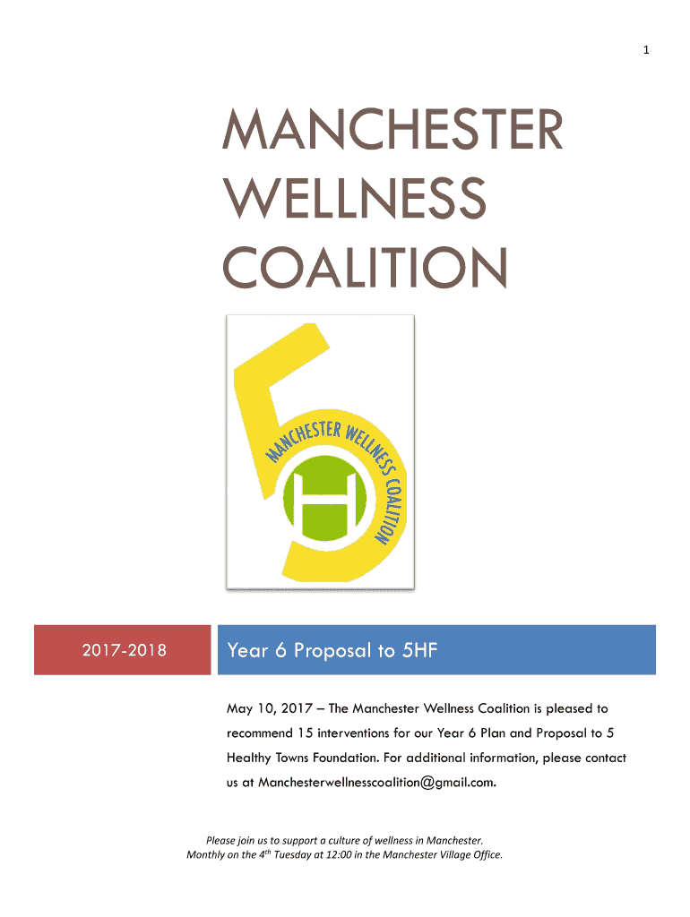 1MANCHESTER WELLNESS COALITION20172018Year 6 Proposal to 5HF May 10, 2017, The Manchester Wellness Coalition is pleased to recommend 15 interventions for our Year 6 Plan and Proposal to 5 Healthy