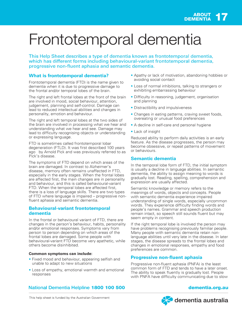 Get the free This Help Sheet describes a type of dementia known as frontotemporal dementia,